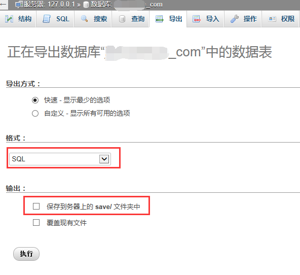 我一般都会选择格式为“SQL”,并将备份的数据库直接保存到服务器的save/文件夹中。导入操作也是非常简单,这里不再复述,只是对于大数据库(500M以内),有时候需要修改以下参数: