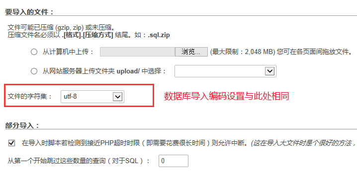 数据库导入编码和phpMyAdmin面板导入工具界面使用的编码相同即可,即默认设置为utf8。