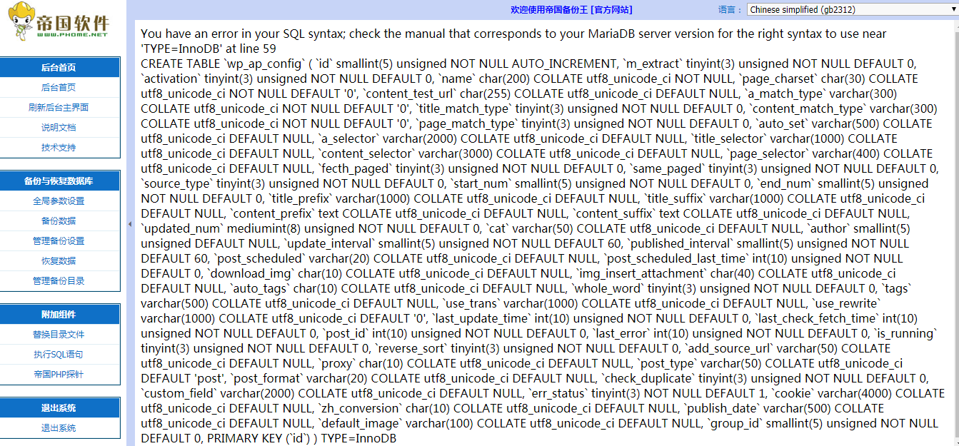 这个方法是备选方案,如果其他方法行不通的时候,可以考虑使用。不过我在操作使用的过程中,出现导入数据库出错,原因可能是我原来的数据库编码规则比较稀烂,导致使用帝国备份王工具导入和导出后,出现编码规则也稀烂的问题。