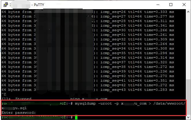 回车后提示输入用户密码,导出成功,文件在/data/wwwroot/目录下,huaiyinjie.sql是导出之后的文件的名字。
