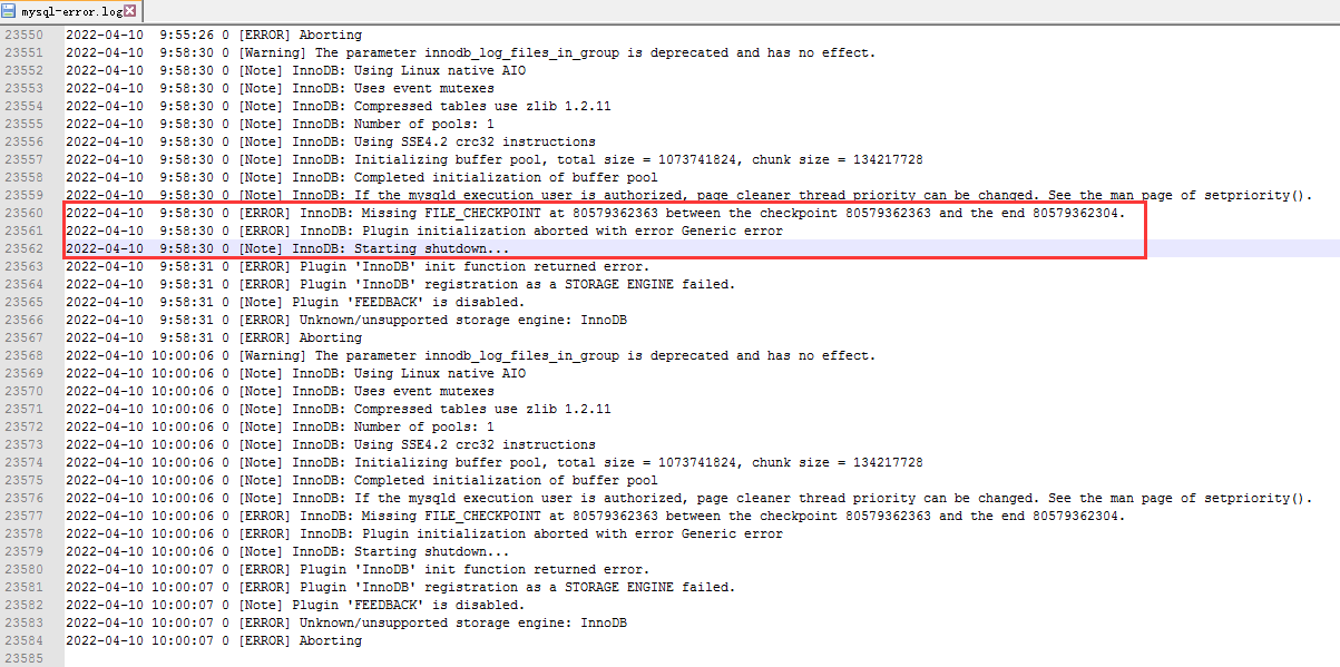 2022-04-10 9:58:30 0 [ERROR] InnoDB: Missing FILE_CHECKPOINT at 80579362363 between the checkpoint 80579362363 and the end 80579362304.