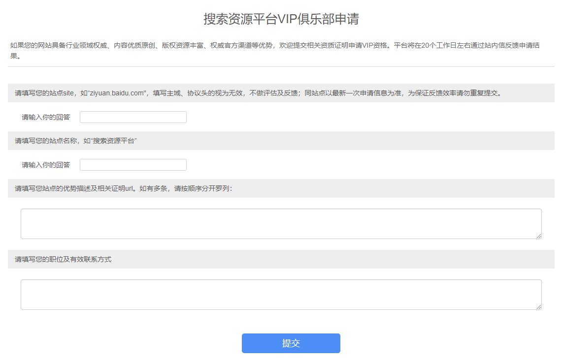 符合上述标准要求的站点,可通过如下链接https://iwenjuan.baidu.com/?code=bi27kk提交申请,工作人员将进行评估审核,并于20个工作日内通过站内信回复申请结果。每个主域下最多申请2个vip站点,建议分别申请PC端和移动端主站点。