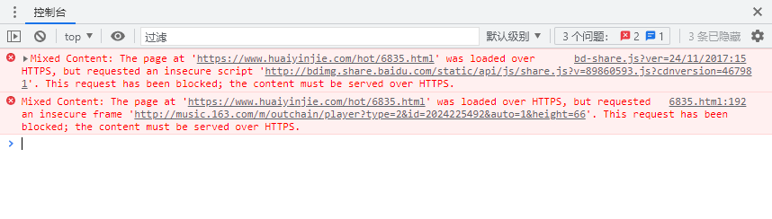Mixed Content: The page at ‘https://xxx’ was loaded over HTTPS, but requested an insecure frame ‘http://music.163.com/m/outchain/player?type=2&id=2024225492&auto=1&height=66’. This request has been blocked; the content must be served over HTTPS.